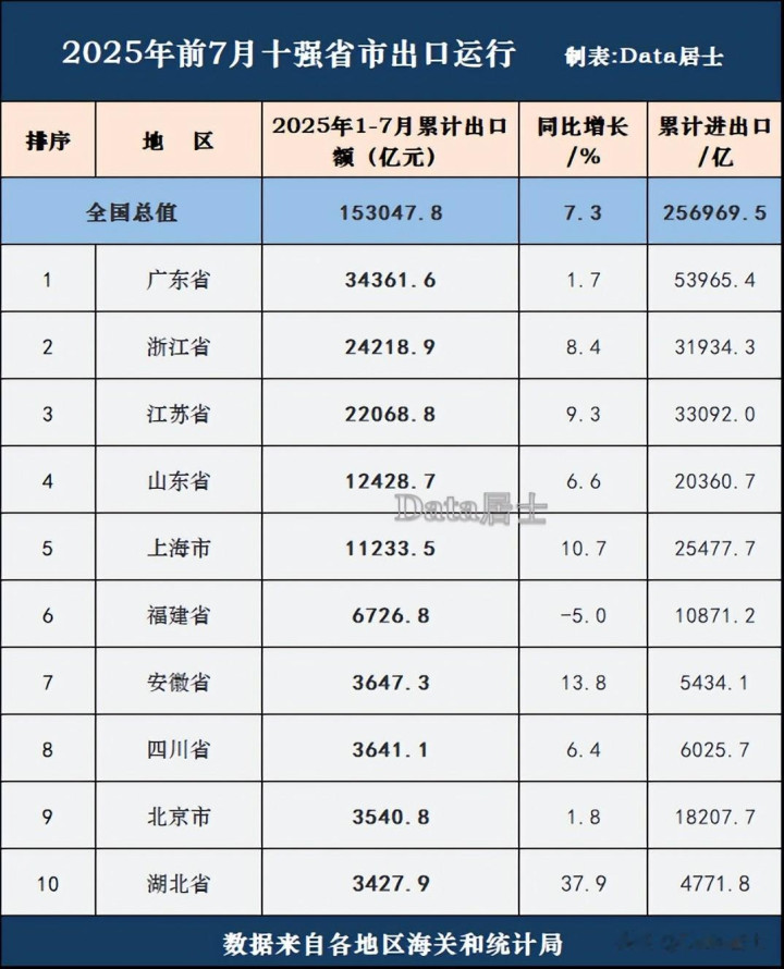 还是来看下表,大家可详细了解十大省市的前7月出口情况: